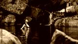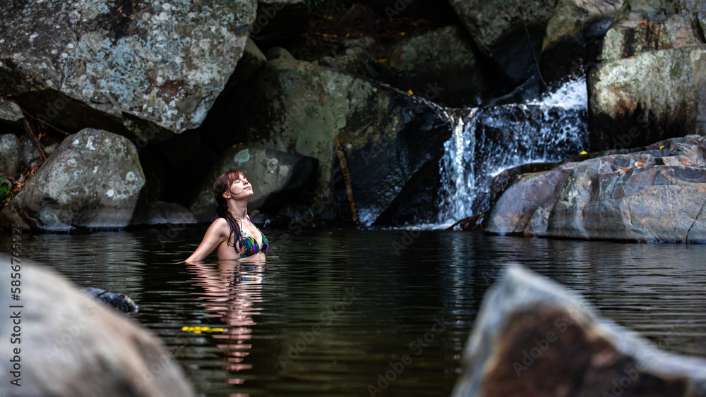 a beautiful girl in a bikini takes a refreshing swim at a waterfall at cedar creek swimming holes near brisbane and gold coast in queensland, australia; hidden gems of australia