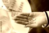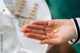 Close-up high-angle view of unrecognizable sick young woman holding medicine for flu, influenza, painkiller, vitamin complex, oral contraceptives on hands on blurred background of table with drugs.