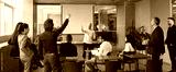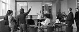 Group of adult students having class with business teacher in modern office interior. Man raises his hand to answer question, ask something or make interesting suggestion. Team training concept banner