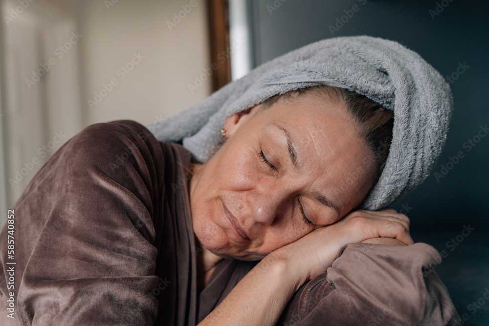 Mature woman in velvet bathrobe and towel on head feeling bad. hangover or feeling sick concept, hard sleepy morning