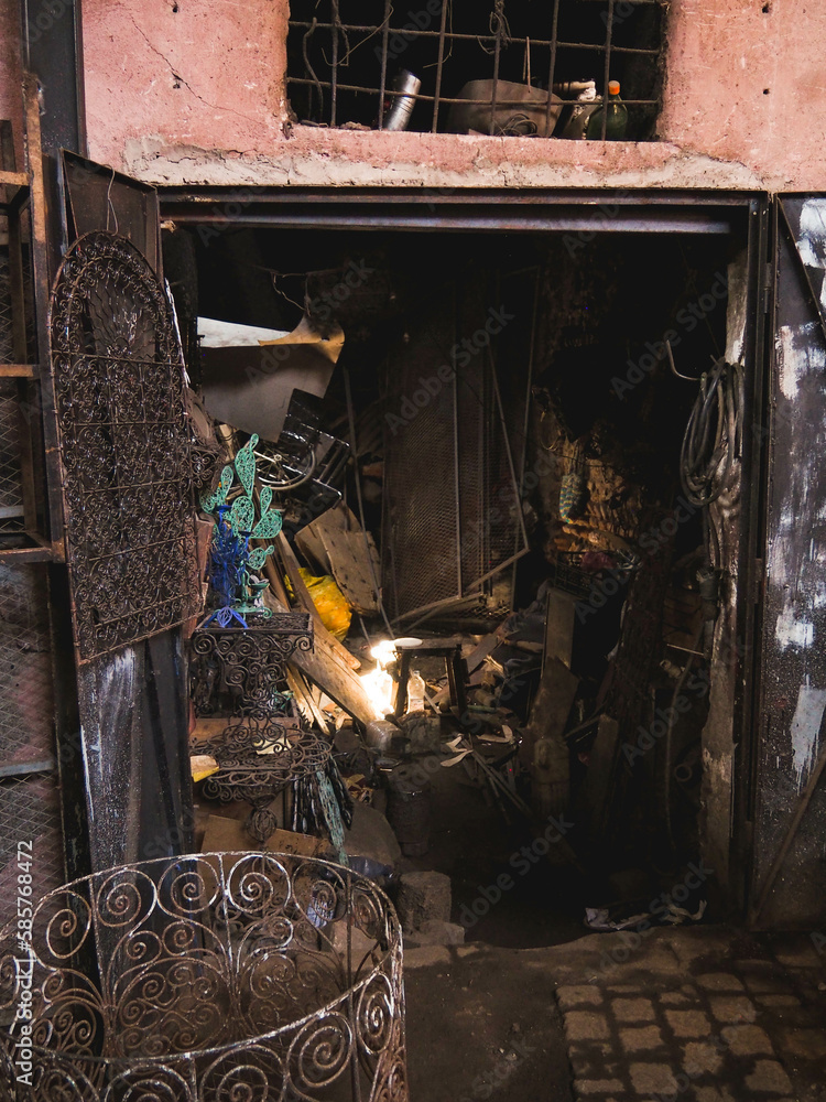 Rays of light in a dark, crowded garage in the busy Souk market alley selling and welding metal wares in the heart of the Medina of Marrakech, Morocco, dark street with sunlight