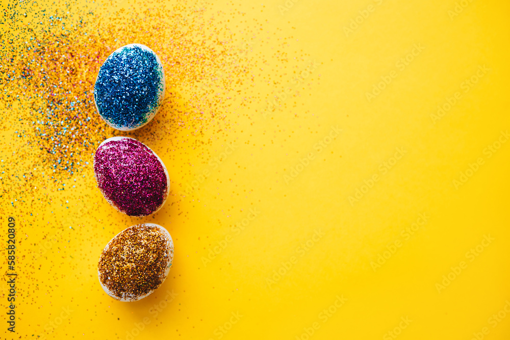 Happy easter! Creative preparing for Easter by decorating eggs with colorful glitter. Happy easter concept