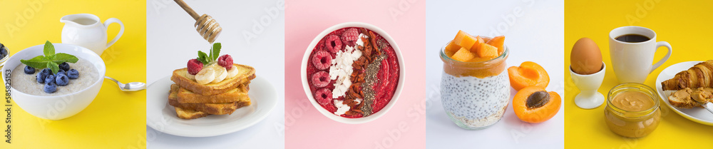Collage of many popular all over the world breakfast on the colored background. Close-up.