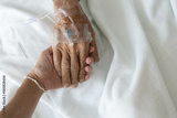 inpatient hand holding from relative or family, palm of an old man clasp his family member for energy support while stay in hospital for modern and high technology medical treatment by skillful doctor