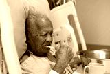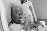 inpatient man brushing teeth for mouth hygiene on patient bed in hospital, a senior try to focus on clean his teeth after meal from modern medical treatment, old guy concentrate with daily mouth care.