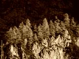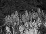 Amazing autumn contrast between golden larch trees and shadowy mountain wall