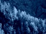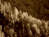 Magnificent autumn contrast between shadowy rocky wall and sunlit larch trees