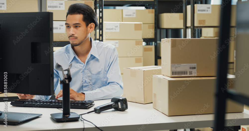 Happy Asian man wear formal uniform shirt sit in front of desk use computer and barcode machine scanner record customer online data in cardboard box delivery at warehouse. Startup business concept.