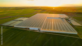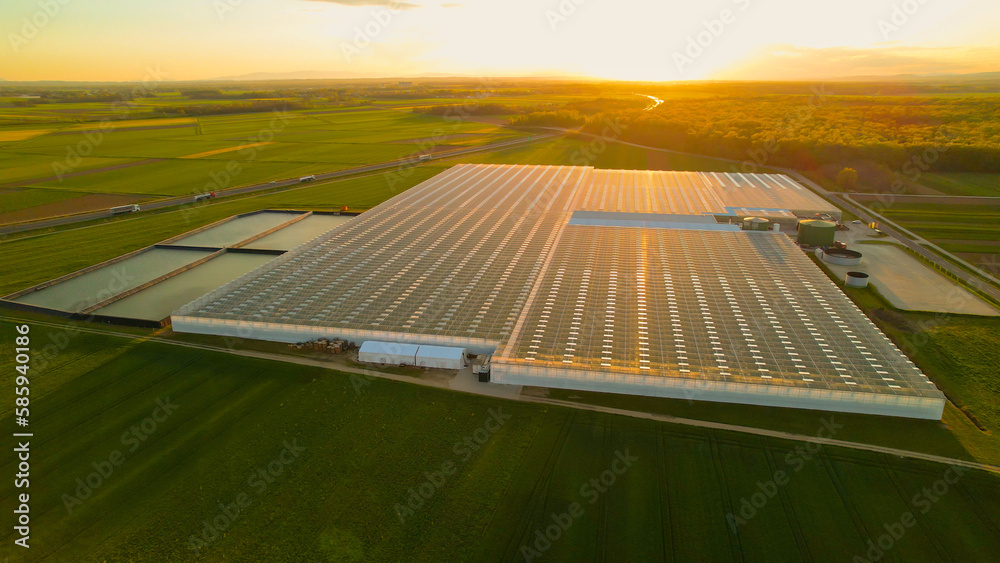 AERIAL Big glasshouse for hydroponic vegetable production in golden sunset light