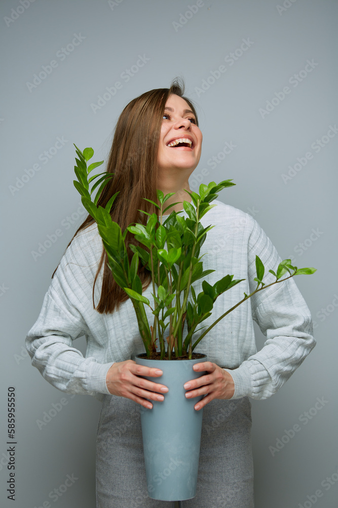 Happy excited woman holding home plant in pot and looking up.