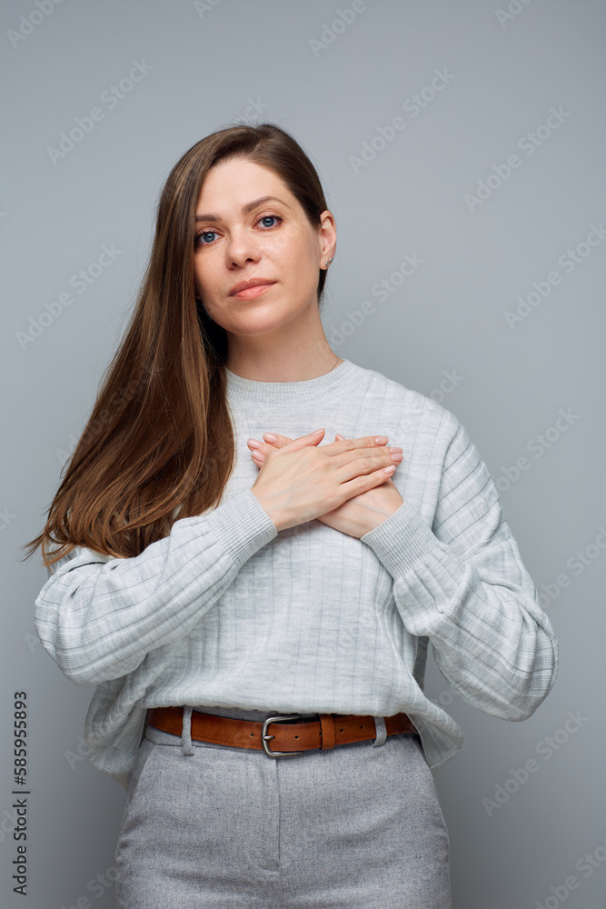 Smiling woman holding hands on chest, Isolated female portrait