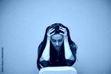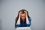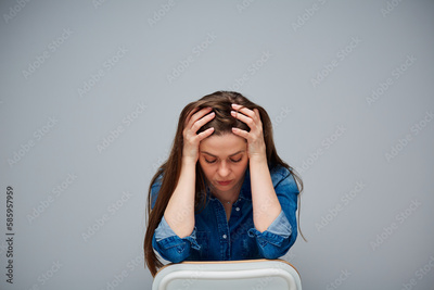 Young woman with headache closed eyes, sits on chair, touch her head, isolated portrait