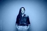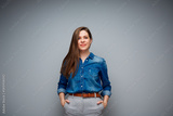 Happy woman in casual denim clothes. Female studio portrait.