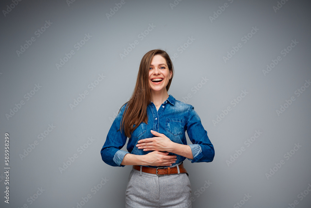 Woman holding hands on stomach and feels good. isolated portrait.