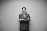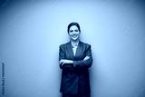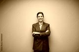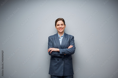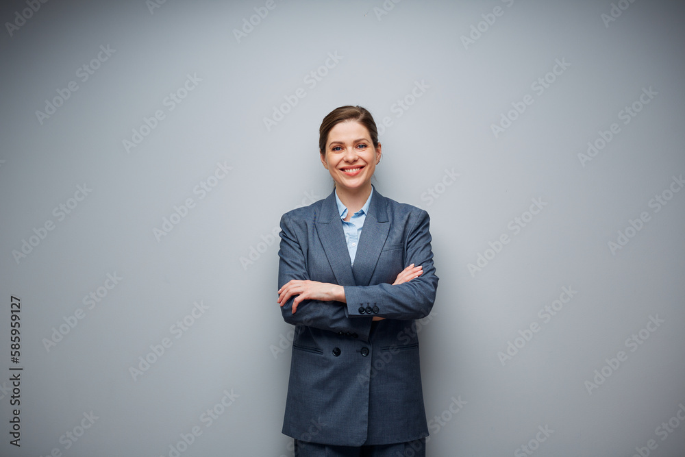 Smiling business woman in gray suit isolated portrait with copy space.