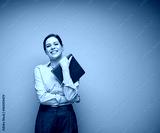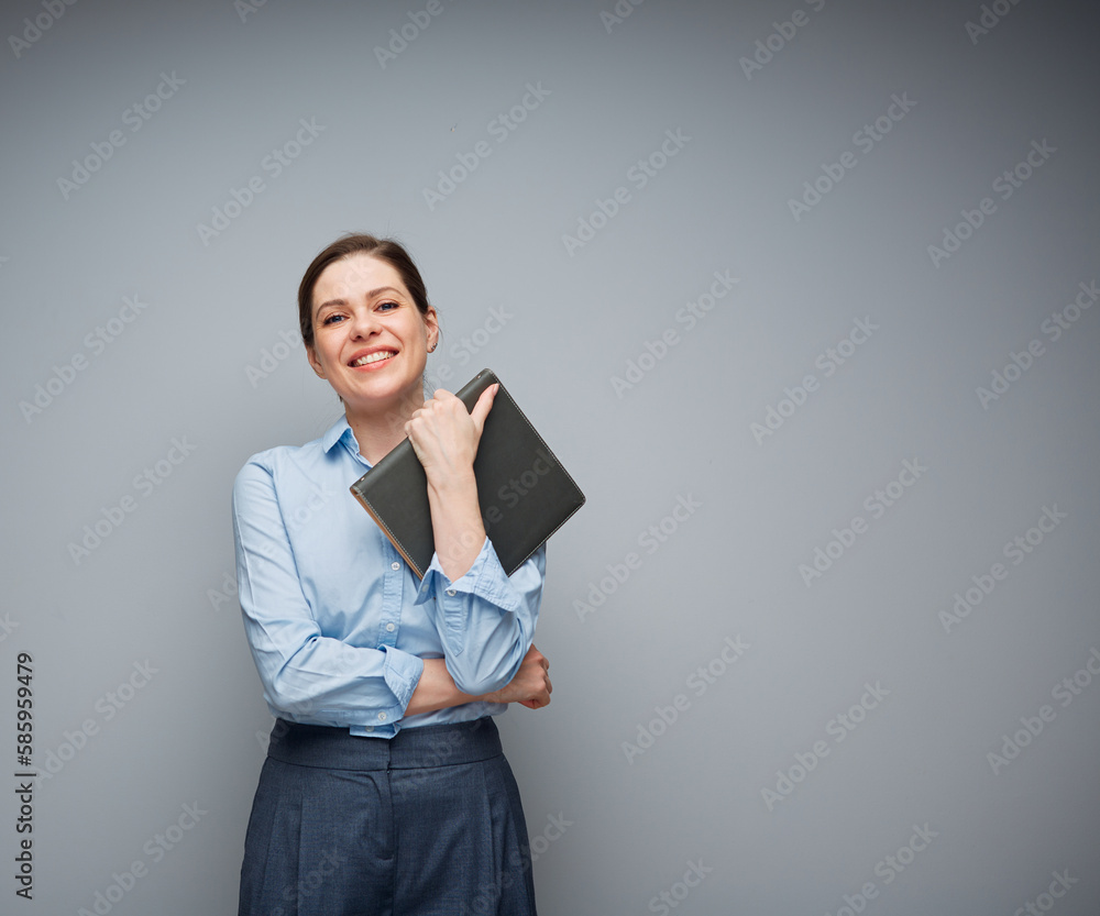 Happy beautiful teacher or student girl, young woman holding book, female portrait..