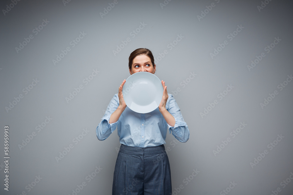 Woman cowered her face with empty plate.