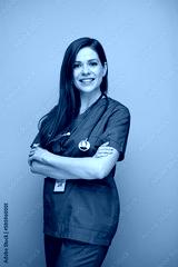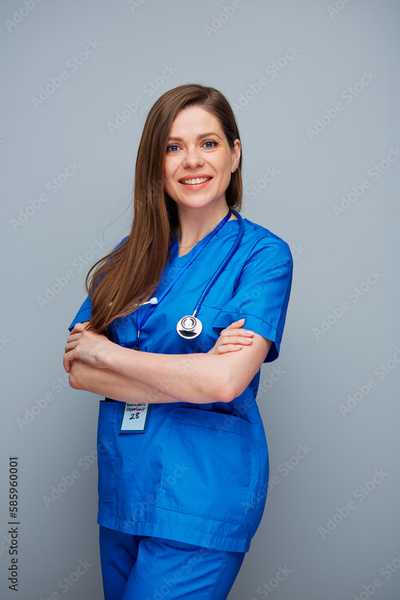 Happy doctor woman or nurse in blue medical suit with toothy smile.