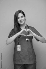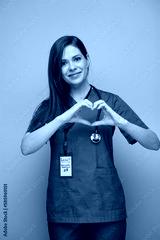 Smiling doctor woman or nurse in blue medical suit making heart shape with fingers.