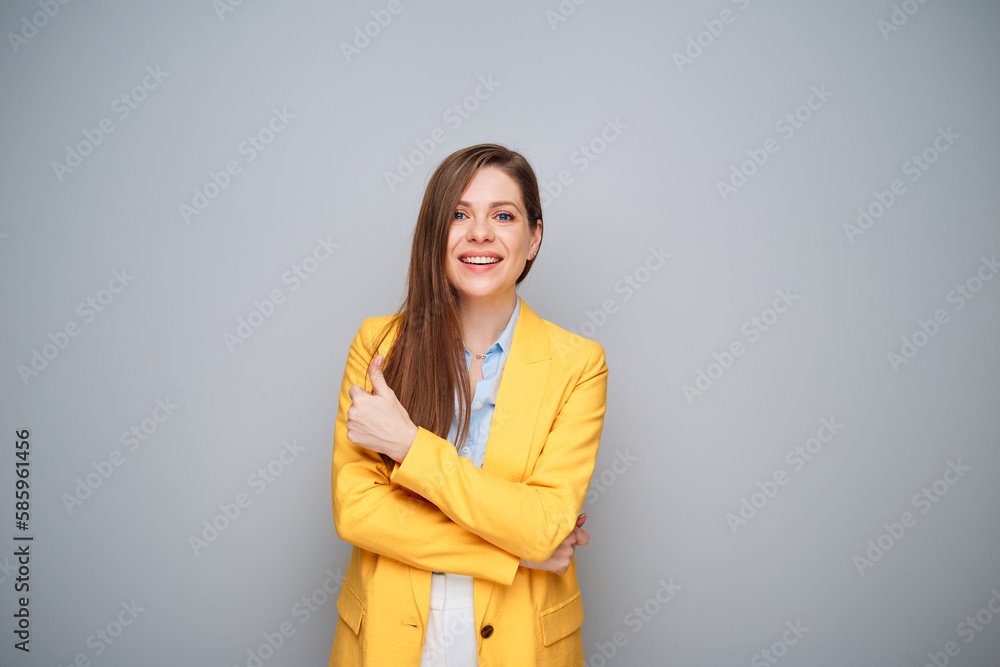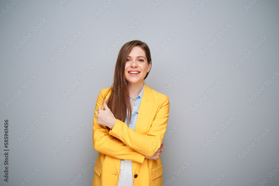Smiling woman in yellow jacket on gray background showing thumb up.