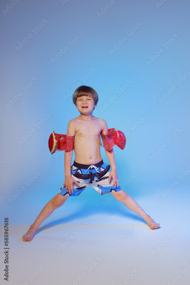 Happy cute boy 6 years old with a life buoy at the blue background