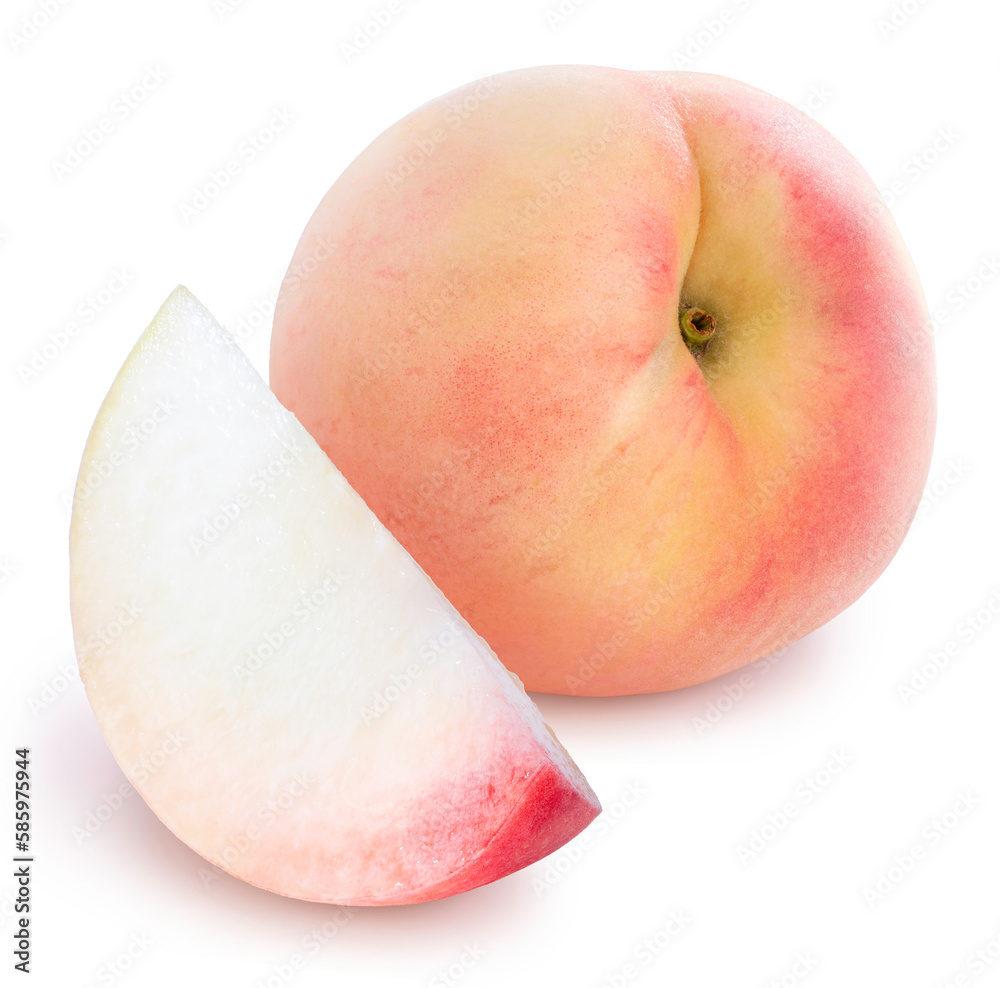 Yellow and Pink Peach fruit with leaf isolated on white background, Fresh White Peach on White Background With clipping path.
