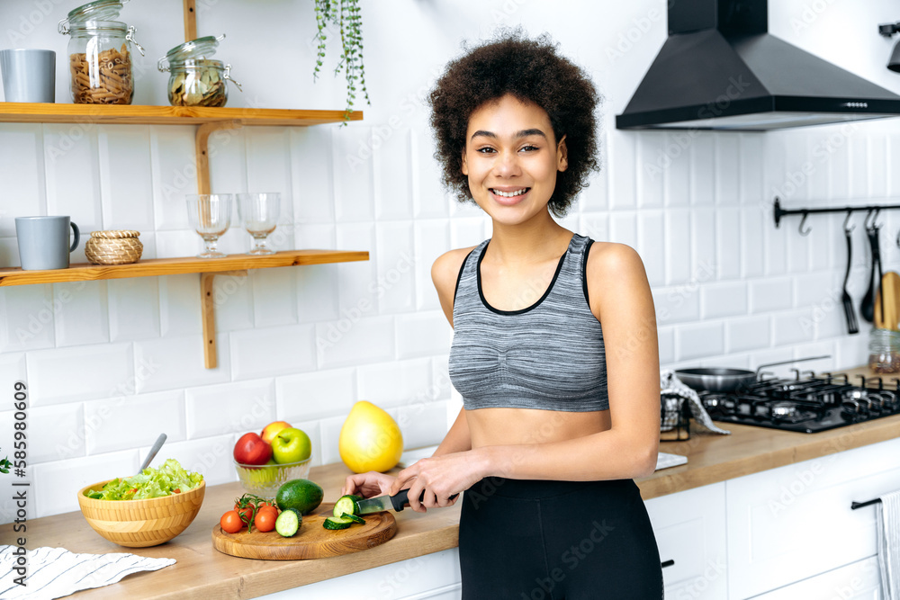 Pretty, positive slim african american young woman in a sportswear, standing at home in kitchen cutting vegetables while preparing fresh salad, looking at camera, smiling friendly