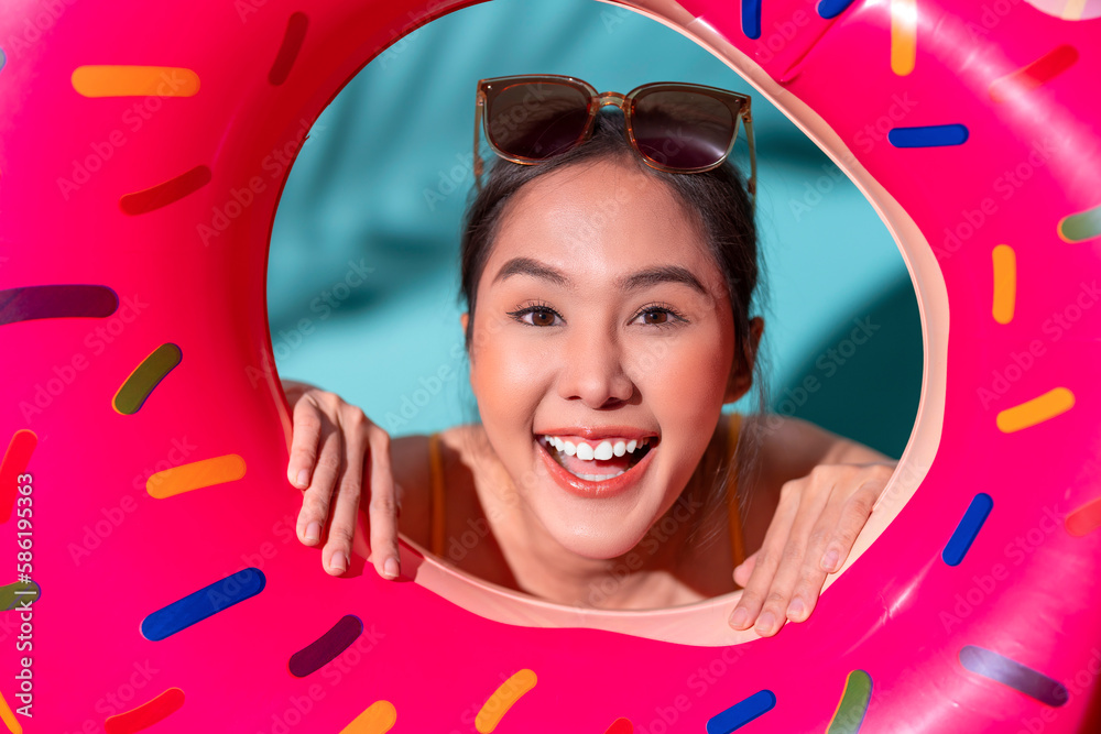 hello summer greeting young asia female woman in swimwear playful joy fun playing face expression hand gesture hold donut shape inflatable, woman ready to have fun in summer time relax casual vacation