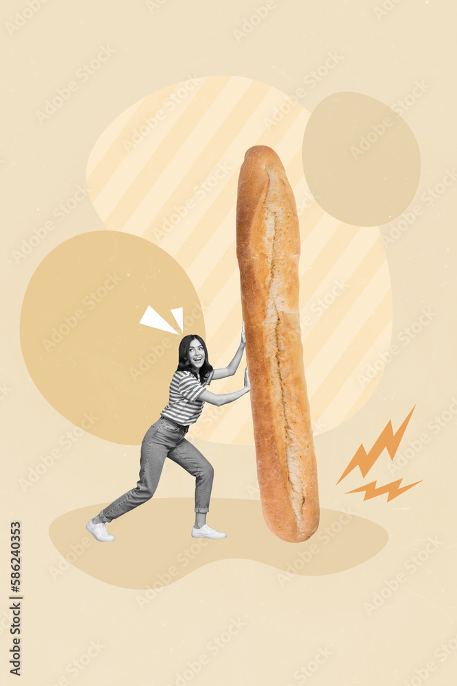 Creative picture collage of funky young lady carry big long baguette loaf bread yummy baker product advert