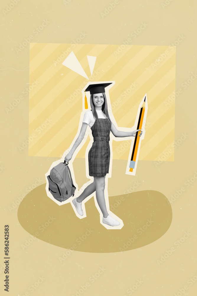 Charming student girl carry backpack big pen pencil wear graduation hat tassel mortarboard best college prefect head girl