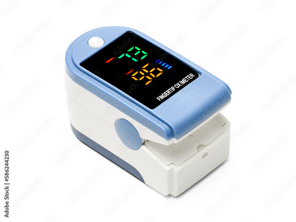 Pulse oximeter device to measure pulse rate and oxygen levels isolated on white background
