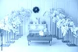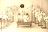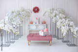 Elegance white living room interior with pink sofa pouf and decorative blossom flowers orchids. Wedding decor. Easter festive decoration with flowers wreath on wall, ceramic rabbits and box with eggs.