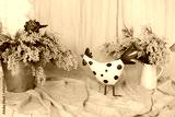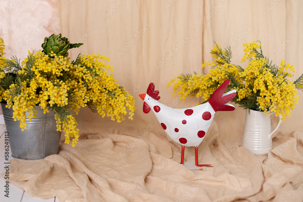 Easter home interior. Spring flowers in a vase and statuette easter chicken on a light beige background. Bouquet mimosa yellow flowers in vase. Branches yellow flowers in a bouquet. Mother's day.