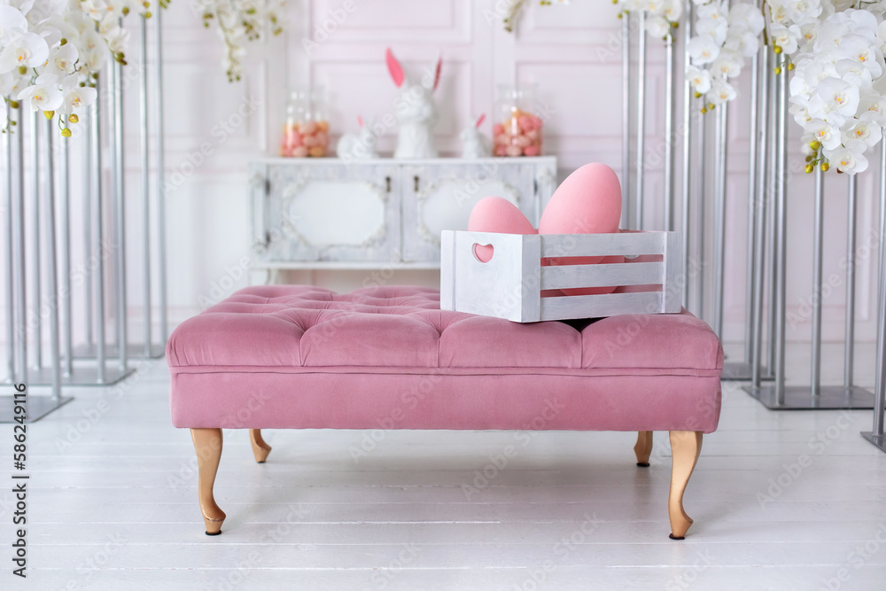Festive Easter decoration of living room. Elegant white living room interior with pink sofa pouf and box with easter eggs. Easter festive decoration with ceramic rabbits and colorful eggs.