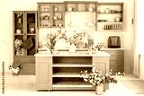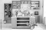 Wooden kitchen in easter decor. Cozy home decor. Kitchen utensils, dishes and plate on table. kitchen island in dining room. Blue kitchen interior with furniture. Stylish cuisine with flowers in vase.