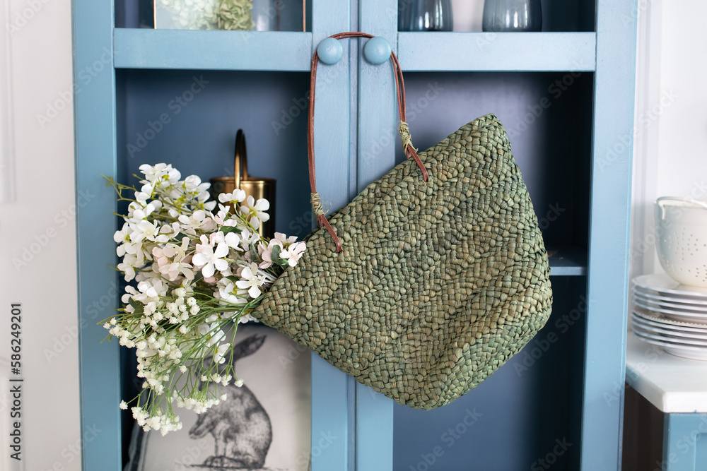 The minimalist interior design of the Scandinavian kitchen is decorated with a hanging wicker bag with flowers. On Wooden blue cupboard hanging wicker basket with white flowers.