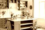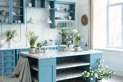Wooden kitchen in easter decor. Cozy home decor. Kitchen utensils, dishes and plate on table. kitchen island in dining room. Blue kitchen interior with furniture. Stylish cuisine with flowers in vase.