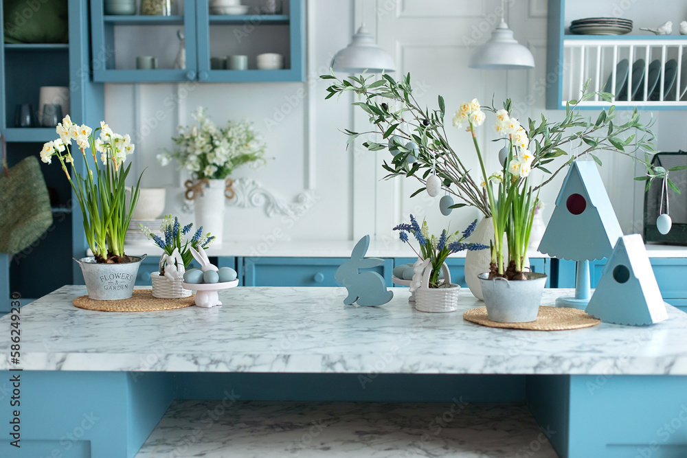 Stylish cuisine with flowers in vase. Wooden kitchen in easter decor. Cozy home decor. Kitchen utensils, dishes and plate on table. kitchen island in dining room. Blue kitchen interior with furniture