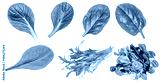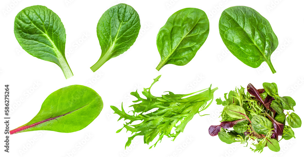 Salad leaves mix isolated on white background. Salad with rucola, spinach, radicchio and lamb's lettuce top view, flat lay.