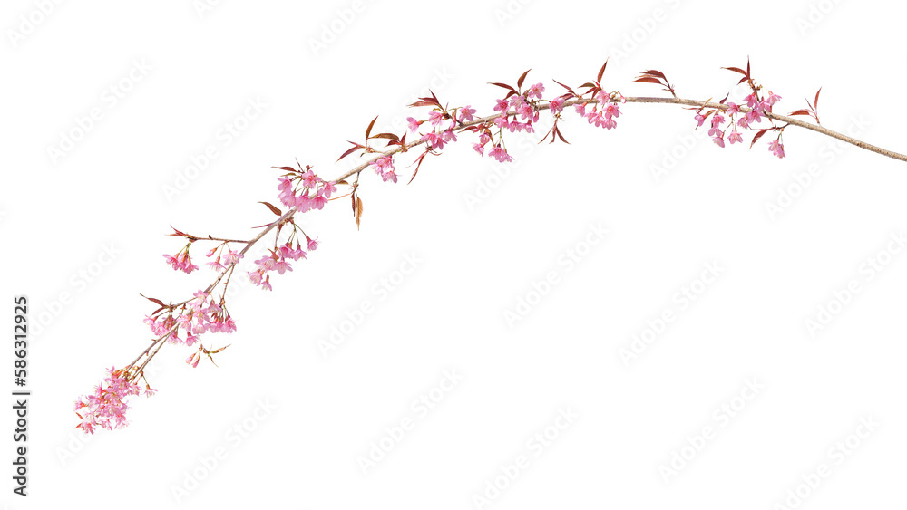 Sakura flowers, a branch of wild Himalayan cherry blossom pink flowers with young leaves budding on tree twig