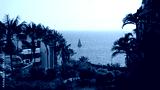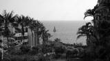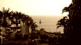 Panoramic view of the Funchal coastline with hotel buildings and a lone sailboat in the ocean