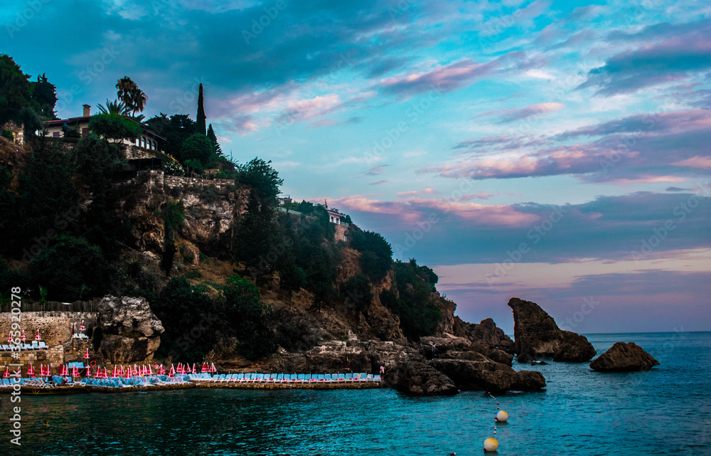 Red lights shining in black and white night time cityscape with the Brooklyn Bridge and buildings of Manhattan in New York City