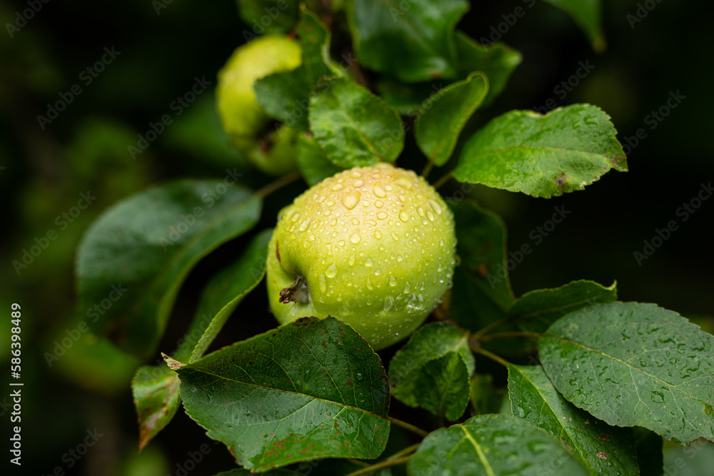 Morning dew droplets rolling down green apple fruit on orchard tree.