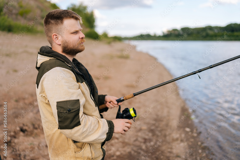 Side view of bearded fisherman holding casting rod wearing raincoat standing on bank waiting for bites on water river at summer day. Concept of lifestyle, leisure activity on nature.