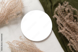 Blank greeting card, invitation and envelope mockup. Minimal floral frame made of dry flowers and branches. Flat lay, top view. Happy mother's day, birthday, wedding composition. Green linen fabric.