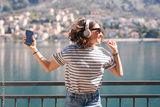 Young happy woman listening to music using headphones while standing on the balcony with amazing lake and mountain views