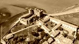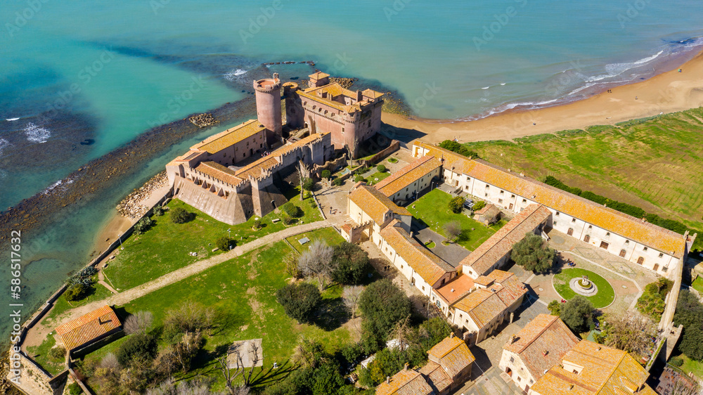 Aerial view of the Castle of Santa Severa, located in Santa Marinella in Lazio, in the Metropolitan City of Rome, Italy. It is a medieval castle built on the beach and overlooking the Tyrrhenian Sea.