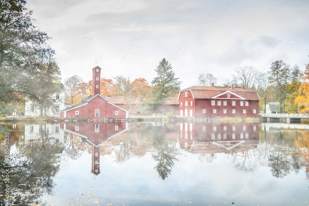The red wooden buildings at the former plant Stromfors in fog, Ruotsinpyhtaa, Finland