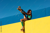 Urban woman enjoy outside. Modern woman posing with roller skates.