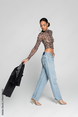 full length of well dressed african american model in crop top with animal print holding black jacket and walking on grey.
